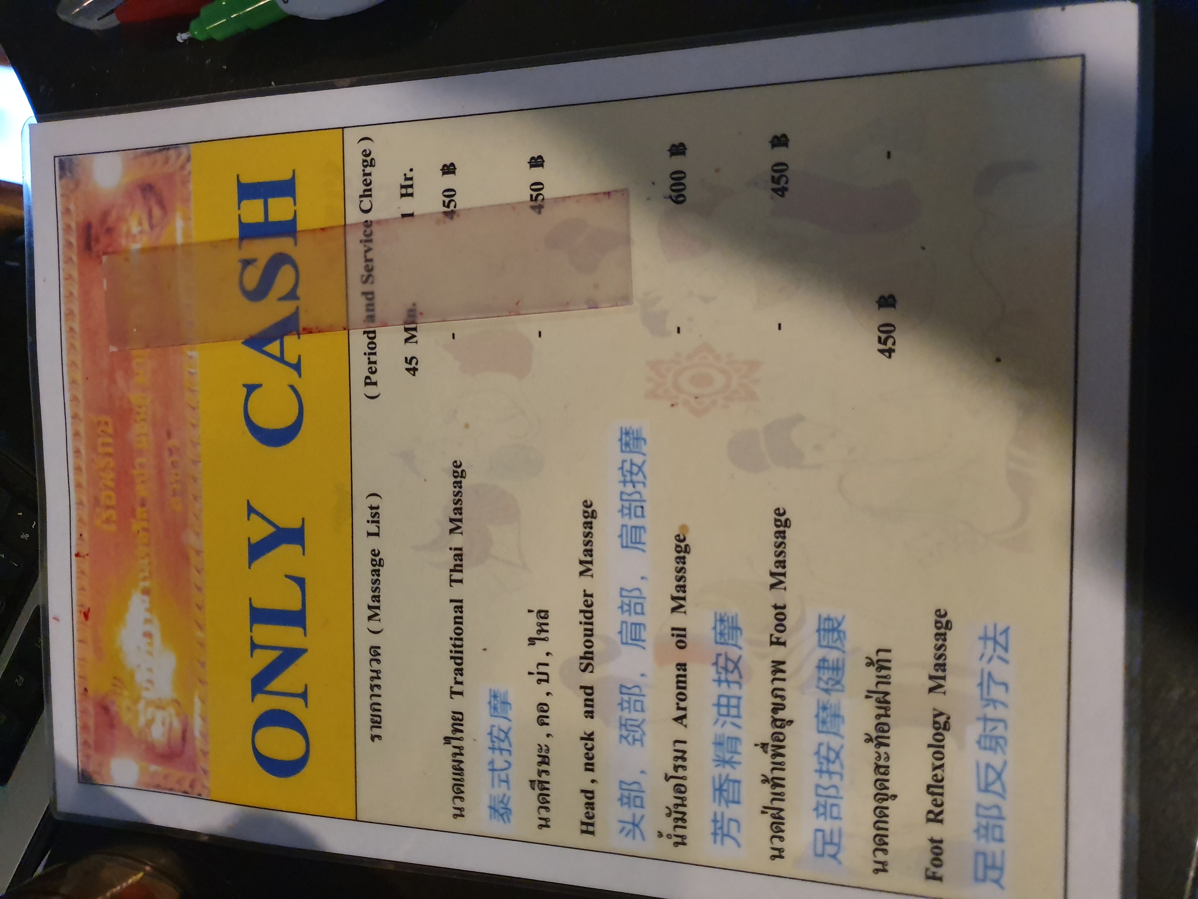 가격은 타이마사지 기준 1시간 450밧. 현금만 받습니다.